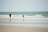 Dwoje dzieci biegnie po piaszczystej plaży w wodzie, na wybrzeżu Morza Północnego w Holandii, Zeeland