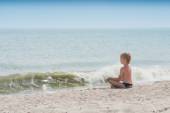 Chłopiec siedzi na piaszczystej plaży w wodzie przed przerwą