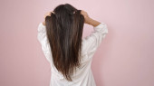 Zdjęcie "Młoda kobieta wiąże włosy. Szare tło." może być wykorzystywane do celów osobistych i komercyjnych zgodnie z warunkami zakupionej licencji Royalty-free. Obraz jest dostępny do pobrania w jakości wysokiej rozdzielczości do 5760x3840.