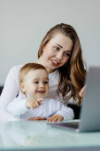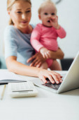 szczęśliwy matka i dziecko dziewczyna patrząc na laptopa na zamazanym pierwszym planie
