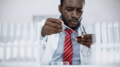 młody afrykański lekarz w białym płaszczu ze stetoskopem patrzący w kamerę