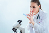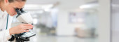 Afrykański amerykański naukowiec w okularach patrzący przez mikroskop