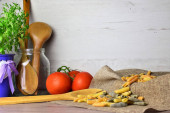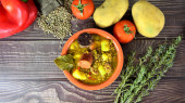 Typowe dla kuchni hiszpańskiej. Gulasz soczewicowy z chorizo i krwistą kiełbasą, podawany w glinianym talerzu. Widok zenitu.