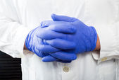 Lekarz zakładający rękawice medyczne na jasnoszarym tle