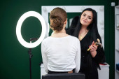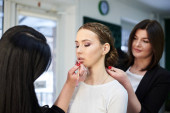 Zdjęcie "Panna młoda szykuje się do ślubu. Profesjonalny wizażysta stosujący rumieniec na twarzy klientki dużą szczotką do makijażu. Proces pracy w studiu kosmetycznym. Zbliżenie na modelu makijażu." może być wykorzystywane do celów osobistych i komercyjnych zgodnie z warunkami zakupionej licencji Royalty-free. Obraz jest dostępny do pobrania w jakości wysokiej rozdzielczości do 5760x3840.