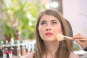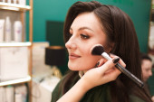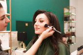 Panna młoda szykuje się do ślubu. Profesjonalny wizażysta stosujący rumieniec na twarzy klientki dużą szczotką do makijażu. Proces pracy w studiu kosmetycznym. Zbliżenie na modelu makijażu.