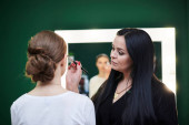Portret charakteryzatora w pracowni kosmetycznej. Proces pracy w salonie piękności. Przygotowujemy się do uroczystej kolacji z pomocą profesjonalnego stylisty.