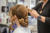 Zdjęcie "Szykuję się na imprezę. Młoda ładna dziewczyna siedzi w salonie piękności, podczas gdy fryzjer i makijaż artysta co jej wygląd piękny. Profesjonalny proces pracy w studio. Kochaj siebie. Poranek panny młodej." może być wykorzystywane do celów osobistych i komercyjnych zgodnie z warunkami zakupionej licencji Royalty-free. Obraz jest dostępny do pobrania w jakości wysokiej rozdzielczości do 5760x3840.