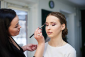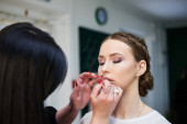 Zdjęcie "Szykuję się na imprezę. Młoda ładna dziewczyna siedzi w salonie piękności, podczas gdy fryzjer i makijaż artysta co jej wygląd piękny. Profesjonalny proces pracy w studio. Kochaj siebie. Poranek panny młodej." może być wykorzystywane do celów osobistych i komercyjnych zgodnie z warunkami zakupionej licencji Royalty-free. Obraz jest dostępny do pobrania w jakości wysokiej rozdzielczości do 5760x3840.