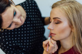 Szykuję się na imprezę. Profesjonalny wizażysta malujący kobiece usta klientów w jasnoróżowym kolorze. Proces pracy w studiu kosmetycznym. Kocham siebie rekolekcje Close-up obraz na make-up model.