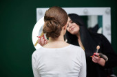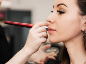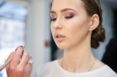 Szykuję się na imprezę. Profesjonalny wizażysta malujący kobiece usta klientów w jasnoróżowym kolorze. Proces pracy w studiu kosmetycznym. Kocham siebie rekolekcje Close-up obraz na make-up model.