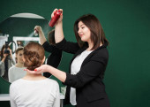 Portret profesjonalnego fryzjera w salonie piękności. Zbliżenie obraz narzędzi akcesoriów do pracy - nożyczki i grzebień w rękach stylisty włosów. Proces pracy w zakładzie fryzjerskim.