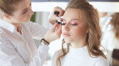 Panna młoda szykuje się do ślubu. Profesjonalny wizażysta stosujący rumieniec na twarzy klientki dużą szczotką do makijażu. Proces pracy w studiu kosmetycznym. Zbliżenie na modelu makijażu.