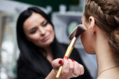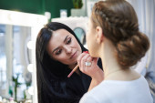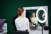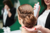 Panna młoda szykuje się do ślubu. Profesjonalny fryzjer robi coiffure dla klientki, stosując lakier do włosów przed dużym lustrem. Proces pracy w studiu kosmetycznym. Zbliżenie zdjęcie fryzury galowej.