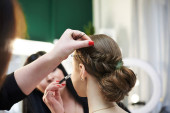 Zdjęcie "Panna młoda szykuje się do ślubu. Profesjonalny fryzjer robi coiffure dla klientki, stosując lakier do włosów przed dużym lustrem. Proces pracy w studiu kosmetycznym. Zbliżenie zdjęcie fryzury galowej." może być wykorzystywane do celów osobistych i komercyjnych zgodnie z warunkami zakupionej licencji Royalty-free. Obraz jest dostępny do pobrania w jakości wysokiej rozdzielczości do 5760x3840.