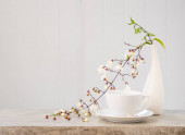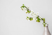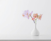 Piękne kwiaty klerodendron kiwnięcia w nowoczesnym wazonie zestaw na betonowym stole z białym tle drewna z miejsca kopiowania, miękki dźwięk martwa natura