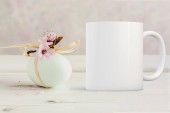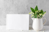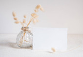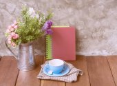 Makijaż białe karty zaproszenie, filiżanka kawy i piękne kwiaty klerodendron kiwnięcia w nowoczesnym wazonie zestaw na betonowym stole z białym tle drewna, kartka z życzeniami w miękkim tonie martwa natura