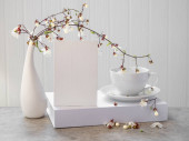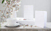 Zdjęcie "Makijaż biały zaproszenie karty, książki i piękne kwiaty klerodendron kiwnięcia w nowoczesnym wazonie zestaw na betonowym stole z białym tle drewna, kartka z życzeniami w miękkim tonie martwa natura" może być wykorzystywane do celów osobistych i komercyjnych zgodnie z warunkami zakupionej licencji Royalty-free. Obraz jest dostępny do pobrania w jakości wysokiej rozdzielczości do 5760x3840.