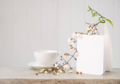 Makijaż biały zaproszenie karty, książki i piękne kwiaty klerodendron kiwnięcia w nowoczesnym wazonie zestaw na betonowym stole z białym tle drewna, kartka z życzeniami w miękkim tonie martwa natura