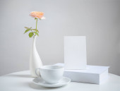 Makijaż biały zaproszenie karty, książki, filiżanka kawy i piękne pomarańczowe kwiaty róży w nowoczesnym wazonie zestaw na obrus płócienny z białym tle drewna, kartka z życzeniami w miękkim tonie martwa natura