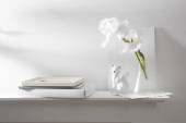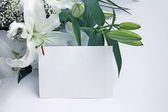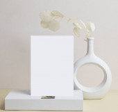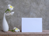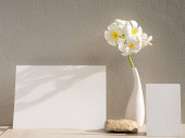Makieta zaproszenie karty i piękne białe kwiaty Plumeria w nowoczesnym wazonie zestaw na marmurowym stole z betonowym tle, kartka z życzeniami w miękkim tonie martwa natura