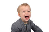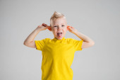 Szczęśliwy chłopiec odizolowany na białym tle studia. Wygląda na szczęśliwego, wesołego, szczerego. Przestrzeń kopiowania. Dzieciństwo, edukacja, koncepcja emocji