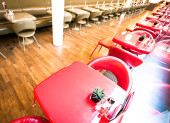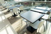Róg stołów z miękkimi wygodnymi fioletowymi krzesłami dla odwiedzających jadalnię nowoczesnego centrum handlowego. Ludzie podziwiają piękny widok podczas posiłku..