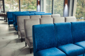 Zdjęcie "Róg stołów z miękkimi wygodnymi fioletowymi krzesłami dla odwiedzających jadalnię nowoczesnego centrum handlowego. Ludzie podziwiają piękny widok podczas posiłku.." może być wykorzystywane do celów osobistych i komercyjnych zgodnie z warunkami zakupionej licencji Royalty-free. Obraz jest dostępny do pobrania w jakości wysokiej rozdzielczości do 5760x3840.