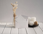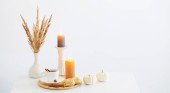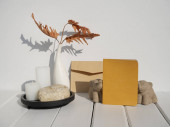 Kartka okolicznościowa makieta na kamiennym podium ślubnym papierowa koperta z zaproszeniem, wazon z suszonymi liśćmi Philodendron, świece na białym drewnianym stole tło wnętrza pokoju z długim cieniem