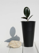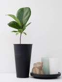 Skrzypce liść rysunek minimalny stylowy houseplant w nowoczesnym czarny wysoki garnek i mały posąg słonia na białym drewnianym stole i tle ściany z długim cieniem, Ficus Lyrata czarny liść.