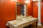 Dwa stoliki z miękkimi, wygodnymi, fioletowymi krzesłami dla odwiedzających jadalnię nowoczesnego centrum handlowego. Ludzie podziwiają piękny widok podczas posiłku..