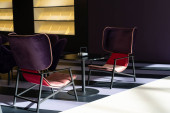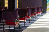 Zdjęcie "Róg stołów z miękkimi wygodnymi fioletowymi krzesłami dla odwiedzających jadalnię nowoczesnego centrum handlowego. Ludzie podziwiają piękny widok podczas posiłku.." może być wykorzystywane do celów osobistych i komercyjnych zgodnie z warunkami zakupionej licencji Royalty-free. Obraz jest dostępny do pobrania w jakości wysokiej rozdzielczości do 5760x3840.