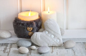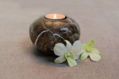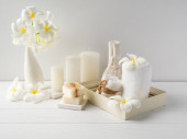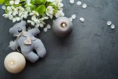 Świece, słoń i Eucalyptus pozostawiają na czarnej drewnianej tacy we wnętrzu pokoju z whiye, produkty kompozycji spa