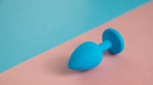 Pompa balonowa różowa pomiędzy kolorowymi balonami spuszczonymi z powietrza, na szarym tle