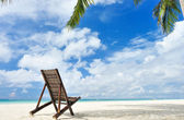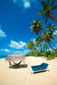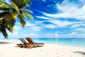 piaszczystej plaży ośrodek z palmami i dwa fotele rozkładane
