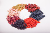 Wielokolorowe tło organicznego ziarna wegetariańskiej żywności zboża soczewica składniki mieszają się z przestrzeni kopii