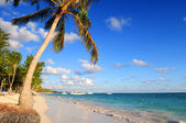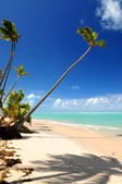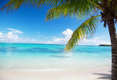 tropikalny, piaszczystej plaży z palmami i łodzie rybackie