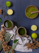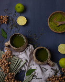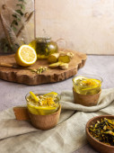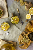 zielona herbata z cytryną i imbirem na drewnianym tle