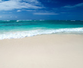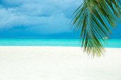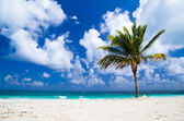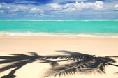 dziewiczej tropikalnej plaży Palma drzewa cieniu na karaibskiej wyspie. kolory są naturalne.