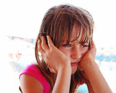 słodkie szczęśliwy piękny naturalny nastolatek dziewczyna obejmujące jej oczy z jej rąk od silnego słońca na jasny słoneczny dzień