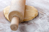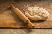Świeże ciasto gotowe do pieczenia. Ciasto chlebowe na drewnianym blacie kuchennym z wałkiem.