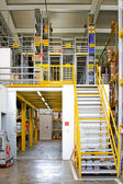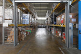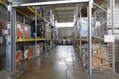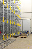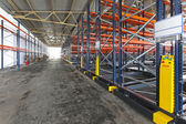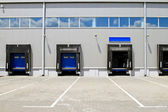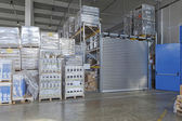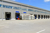 Wózek widłowy pojazdu przed drzwi ładunkowe w dystrybucji magazynu