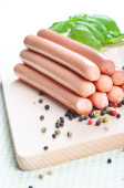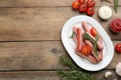Świeże surowe wegetariańskie kiełbaski z bazylią i warzywami na drewnianym stole, płaskie leżaki