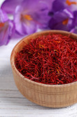 Suszone szafran i kwiaty krokusa na białym drewnianym stole, płaskie leżaki
