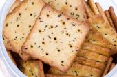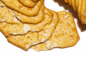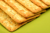 Makro strzelanie chrupiące przyprawy krakersy na białym naczyniu