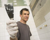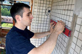 młody mężczyzna patrząc w okno stoi na drabinie z okna sprzątaczka.