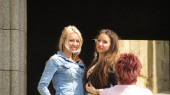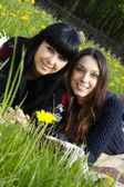 dwóch nastoletnich przyjaciół dziewczynka siedząc w liceum, opierając się na ławce rozmowa i studia ze sobą z ich torby obok nich.