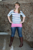 szczęśliwy młody blond nastolatkę stojącą przed ściany Cegła uśmiechający się.
