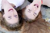 bliska dwa piękne młode nastoletnich dziewcząt w trawie patrząc w chmury.
