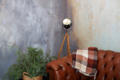 Nowoczesny pokój do makijażu wnętrz. Stół z lustrem przy ciemnej ścianie. Garderoba z lustrem i stołem do makijażu. Miejsce fryzjerskie dla fryzjera i charakteryzatora - fotele i lustro oświetlone.